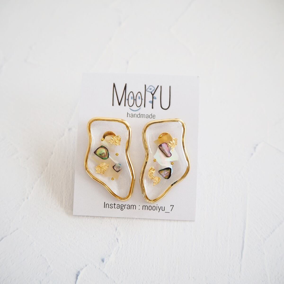 変形したリングの中にシェルと金箔があしらわれていて、目を引く大人っぽさのあるアクセサリー。